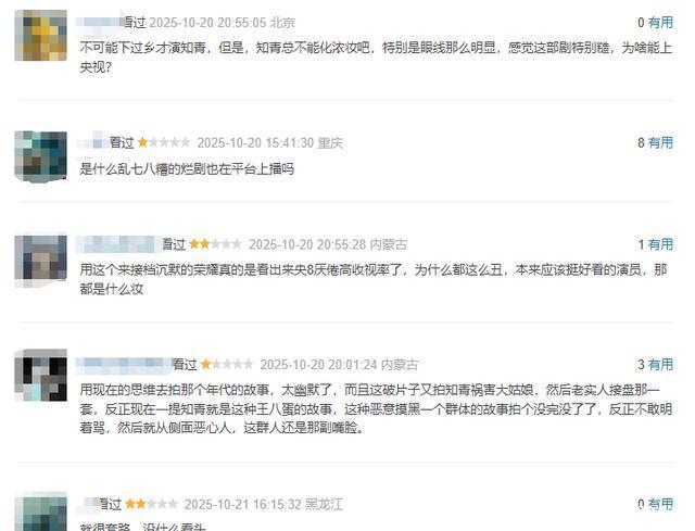 知青的含义是“年轻的知识分子”,可剧中的演员们都是“大叔”和“阿姨”。 即便穿上那个时代的服装,也没有那个时代知青的任何影子,属于是演艺圈中所谓的“以老扮嫩”。 除此之外,张可盈饰演的女知青曲芳菲,更是受到了观众大量吐槽,形象上太辣眼睛。